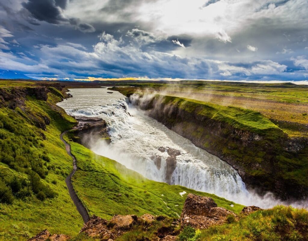 Percieve the Gullfoss breathtaking force of nature as this majestic two-tiered waterfall crashes into a deep canyon, often surrounded by glistening rainbows in the mist.