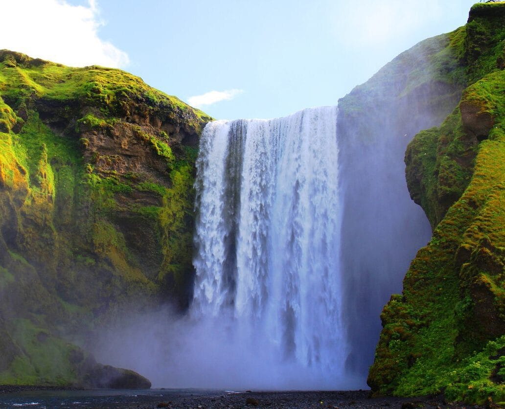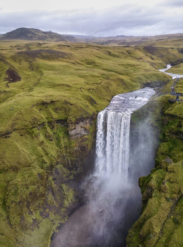 Experience Skógafoss which is a curtain of water cascading from a towering height. The site is memorable not only for its powerful flow but also for the opportunity it provides to see the waterfall from two distinct viewpoints: up close at the base and from a viewing platform at the top.